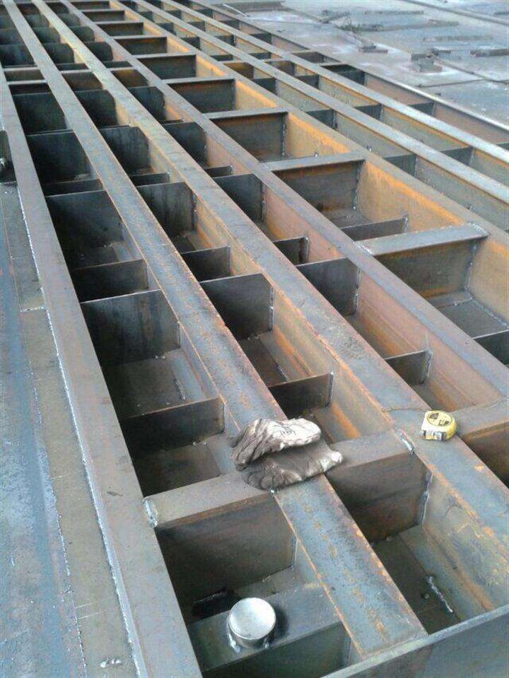 先說(shuō)槽鋼秤體,它是以槽鋼為主梁,再以橫隔板一道道的相連,底部再用封板.